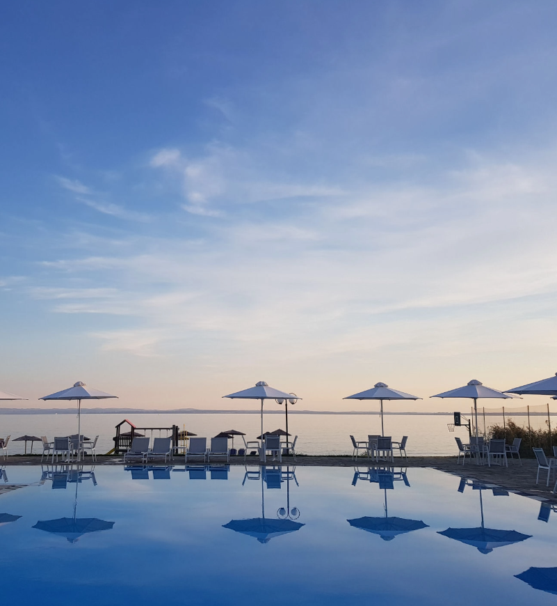 A pool for all ages, in a welcoming courtyard setting with a sea view.